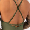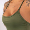 Estilo Distinto: As alças cruzadas e a cor verde militar se harmonizam para um visual impactante e único.