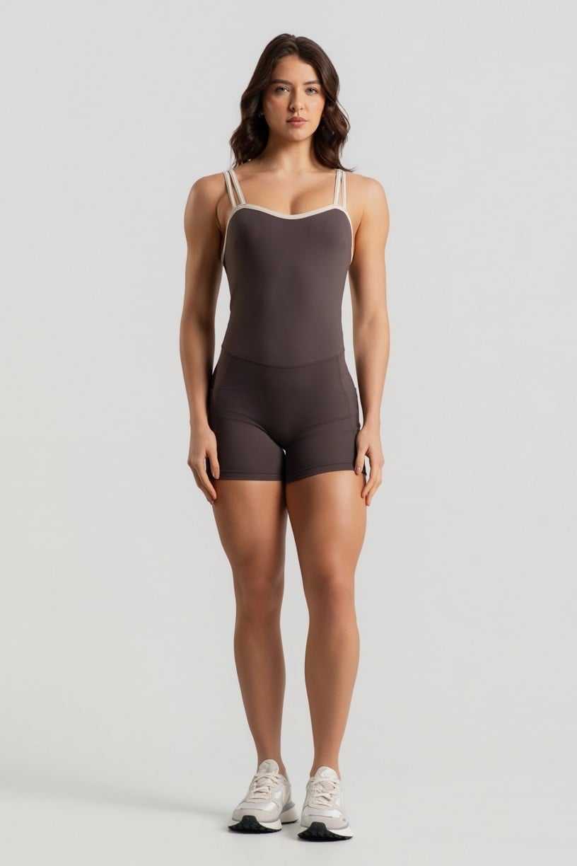 Macaquinho com Alças Duplas e Decote Sinuoso (Trufa / Off-White) | Ref: K4947-A